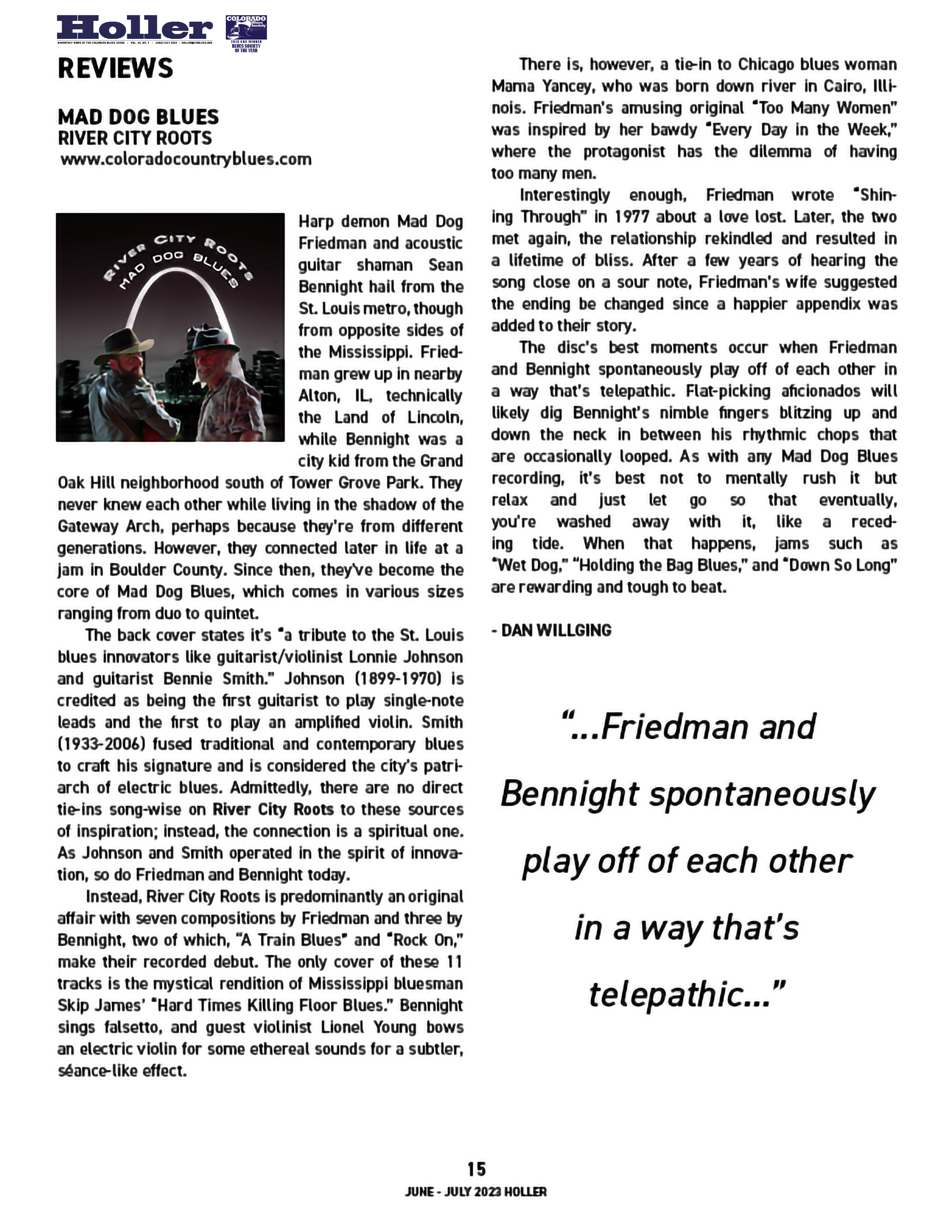 Press Kit & Press ClippingsClick to download or view our current Electronic Press Kit (EPK). Here's what folks have to say about Mad Dog Friedman & Mad Dog Blues: "Mad Dog's traditional acoustic blues harmonica playing...is a delight to hear." ~ Peter Madcat Ruth, Grammy Award-winning harmonica virtuoso "It's as if E.T. plays the harmonica!!!! I dig your take on the instrument, seeking and speaking!!"~ Sugar Blue, Grammy Award-winning harmonica virtuoso "Overall, a pure gem. Sit down and have a listen of a couple true originals doing a down-home CD that will transport you to an old barn in the South in the 20s where folks have gathered to have a good old time drinking ‘shine’ and eating catfish and chicken while dancing to sweet hokum blues. This is the type of act that deserves to be standing on the finals stage at the IBC in Memphis." ~ Chick Cavallero for the High Plains Blues Society "Mad Dog Blues' eighth album - which contains a myriad of fun surprises - is a toe-tapping, finger-snapping, genre-bending journey through the musical minds of Boulder's foremost acoustic blues jam band. One of the more audibly interesting music releases to grace one's eardrums...a sound that is simultaneously timeless and forward-thinking. ...All the Way doesn't quite fit into a box. Rather, it is a testament to the band's dedication to preserving and evolving the diverse musical traditions that define American music." ~ Ella Cobb, Boulder Daily Camera, August 16, 2024 (View a full reprint of the article without a paywall in the Colorado Hometown Weekly) "The group is fortunate to have two splendid guitar flatpickers, Sean Bennight and Mark Kaczorowski; a mandolinist, Jeff Becker; a bassist, Clark Chanslor; and the ringleader, Mad Dog Friedman, who has no shortage of expression playing the harmonica, either with power or finesse. The group's chemistry is so tight that its jamming has to be telepathic." ~ Dan Willging, Oct/Nov 2024 Holler from the Colorado Blues Society "Mad Dog and friends have concocted a delightfully executed slice of acoustic enjoyment. ...What we have here are virtuosos on their given instruments. The presentation and production are first rate. Truly a breath of fresh air." ~ Posted on September 30, 2024 by Greg "Bluesdog" Szalony, (View the full ALL THE WAY album review at Blues Blast Magazine.) "Led by harmonica player Mad Dog Friedman, who is well known for his total delivery on stage and his passionate harmonica playing, this new recording gets inspiration in American roots music tradition, without forgetting some genuine blues, along fifteen songs that invite listeners to a journey where they will discover the most representative landscapes of the rich musical heritage that comes from styles like folk, country, roots music and blues, all of them developed with good taste, elegance and good knowledge by the whole band, which even dares to include four instrumental songs that show these musicians’ and the invited guests’ talent." "As Mad Dog himself says, this album only aims to be a tribute to American music of all time, and the true thing is they manage to make listeners feel they are in the middle of those beautiful roads and can deeply feel the call of the most real, true and genuine America." ~ October, 2024, All the Way album review on the "La Hora del Blues" Radio Show from Barcelona (Spain). Here are links to the full review: https://lahoradelblues.com/en/mad-dog-blues-all-the-way/ (English Version) & https://lahoradelblues.com/mad-dog-blues-all-the-way (Original Spanish Version) "...Friedman and Bennight spontaneously play off of each other in a way that's telepathic..." ~ Dan Willging, June-July 2023 Holler from the Colorado Blues Society "...raw, real, fun and most certainly shines a beacon for live Blues the whole world over." ~ Steve Sheppard, presenter (DJ) at One World Music Radio "While MDB works within a loose country blues framework - where else would you hear a Native American flute in the mix – the collective maintains its signature that makes it distinct along the Front Range blues scene." ~ Dan Willging, April-May 2022 Holler from the Colorado Blues Society "...refreshing and totally enjoyable music." ~Greg “Bluesdog” Szalony, November 3, 2022, Blues Blast Magazine "...ego-less music from a tight-knit group who plays like an extended family." ~ Dan Willging, Feb.-March 2021 Holler from the Colorado Blues Society "Mad Dog Blues is one of our own - a Colorado band steeped in country blues but expanding that genre to express its own eclectic approach to Colorado music."~ Jack Grace, Oct.-Nov. 2021 Holler from the Colorado Blues Society "We are fortunate to have Colorado bands such as Mad Dog Blues that build on true traditions while absorbing and blending our local piquant flavors." ~ Jack Grace, Feb.-March 2021 Holler from the Colorado Blues Society "...rides the fine line between being both relaxed and energetic. Great musicianship, great songs and great production." ~ Rhys “Lightnin'” Williams, Sept. 5, 2021, Blues Blast Magazine "Now the rootsy musician, along with his band, the Mad Dog Blues Experience, kicks up a dusty fusion of acoustic blues and string band-influenced jamming." ~ Nick Hutchinson, Westword magazine, March 27, 2020 "Fine night of sharp, syncopated Blues. Wonderfully expressive performance with a depth of feeling and sense of humor and play you don't always find together." ~ Duane Davis, owner of Wax Trax Records in Denver, Colorado. "Since the group is so acoustic-based, in places it's easy to imagine it fitting into the Greenwich Village folk scene in lower Manhattan during its 60s heyday " ~ Dan Willging, June/July 2025 Holler from the Colorado Blues Society "Mad Dog Friedman — harmonica player and principal songwriter for the group Mad Dog Blues — knows what’s up. As he says it, he writes from the moment and sings from the heart." The act's newest, Happy Dance, was recorded live at the KGNU studio and amplifies 