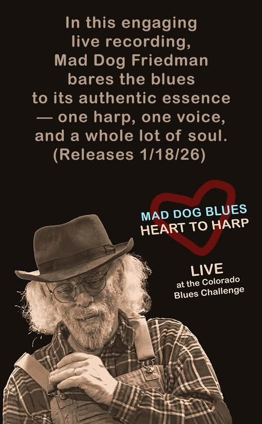 Mad Dog Blues SoloThe Home of Mad Dog Friedman's Solo Harmonica BluesWinner of the 2025 Colorado Blues Challenge (Solo/Duo Award) TO CELEBRATE WINNING THE COLORADO BLUES CHALLENGE, I AM OFFERING THE RECORDING OF MY WINNING SET EXCLUSIVELY TO MAD DOG TRIBE MEMBERS! HEART TO HARP -Recorded LIVE at the Colorado Blues Challenge (A Mad Dog's Tribe Exclusive -->Releases to the world on 1/18/26, but you get it now when you join Mad Dog's Tribe!) Get all 60 of my albums (now for only $25) plus anything I make in the next 12 months. (In 2025 I released 4 albums, 2 EPs & a single.) You can also contribute more when you join, which would really help. Thank you for your support. Mad Dog Blues Solo's first EP, Live & Alone(Released Aug 1, 2025) is a recording of the debut performance of Mad Dog Blues Solo, featuring the solo harmonica blues of Mad Dog Friedman. This video was filmed at Longmont Public Media as part of the Cosmos Cooperative's Stellar Sundays Community Potluck & Creative Showcase on June 8, 2025 Mad Dog Friedman has just recorded an audio and video project called Mad Dog Blues - Live & Alone. In the tradition of Peg Leg Sam, Jaybird Coleman, Deford Bailey, and the early recordings of Sonny Terry, Mad Dog's new recording project is a harmonica and vocal performance, recorded live, with no additional accompaniment. It is raw, bare-boned, intense, and definitely worth checking out. Thank you, Mad Dog, for keeping this tradition from dying out. ~ Peter Madcat Ruth, Grammy Award-winning harmonica virtuoso LIVE VIDEO EP